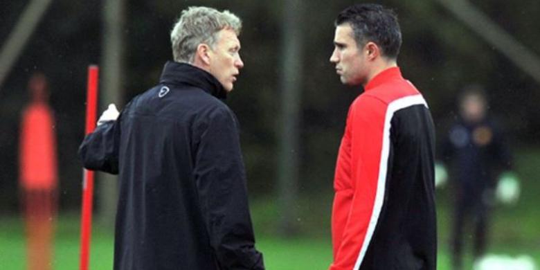 Pelatih Manchester United, David Moyes (kiri) bersama Robin van Persie.