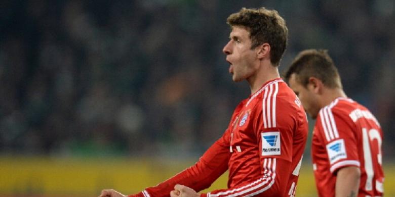Bayern Muenchen, Thomas Mueller, merayakan gol penalti yang dicetaknya