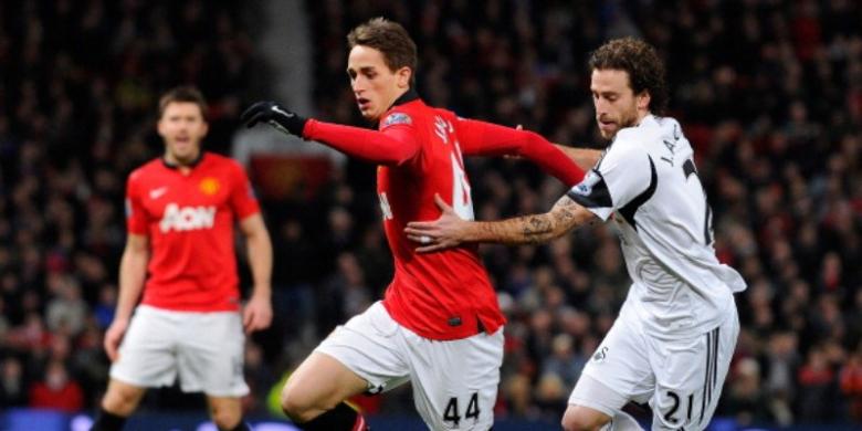 Gelandang Manchester United, Adnan Januzaj (kiri), mendapat kawalan dari bek Swansea City, Jordi Amat (kanan), dalam laga Premier League di Stadion Old Trafford, Manchester, Sabtu (11/1/2014).